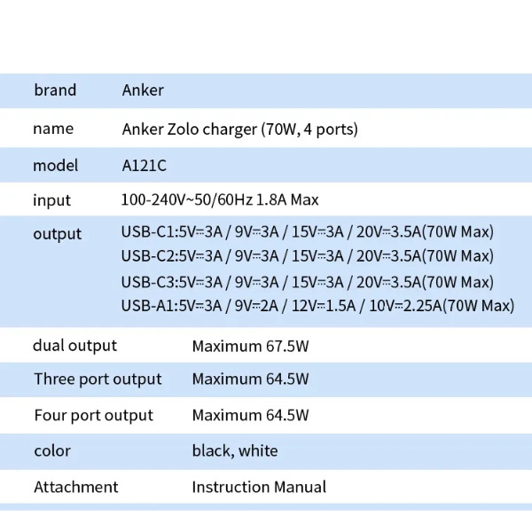 Experience the perfect blend of power and portability with the Anker Zolo 70W GaN Charger. Designed for the modern multi-device user, this 4-port powerhouse ensures you never have to choose which device to charge first. Whether you are powering up a MacBook Air at full speed or managing a suite of mobile gadgets, the Zolo A121C delivers reliable, high-speed energy in a compact, travel-friendly frame.