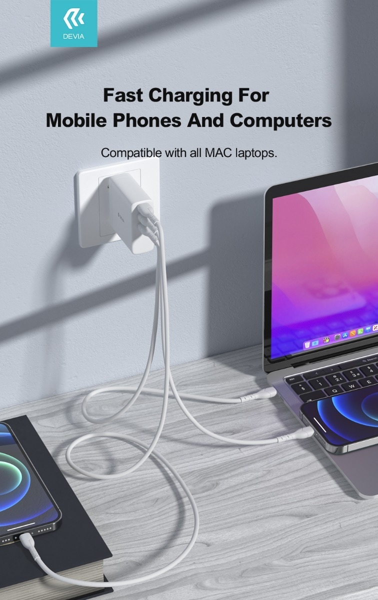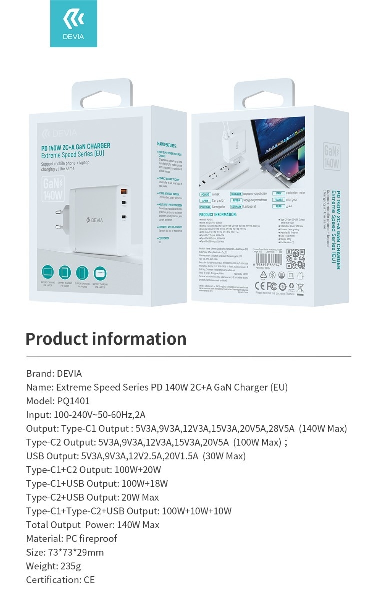 Devia ديفيا شاحن Extreme speed series قوة 140 وات 2C+A Gan Charger EU - أبيض