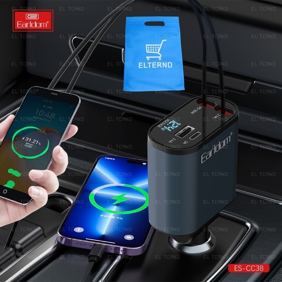 Earldom شاحن سيارة عالمي ES-CC38 مع شاشة عرض الجهد (4 في 1) يدعم الشحن السريع 66 واط مع كابلات قابلة للسحب مدمجة + حقيبة EL-TERND