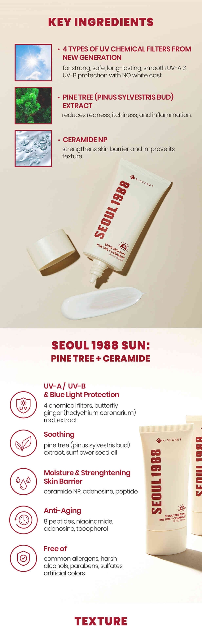 واقي شمس خفيف الوزن بعامل حماية من الشمس 50+ PA++++، غني بمستخلص الصنوبر والسيراميد لتهدئة التهيج وحماية حاجز البشرة مع منحها لمسة نهائية طبيعية متألقة.