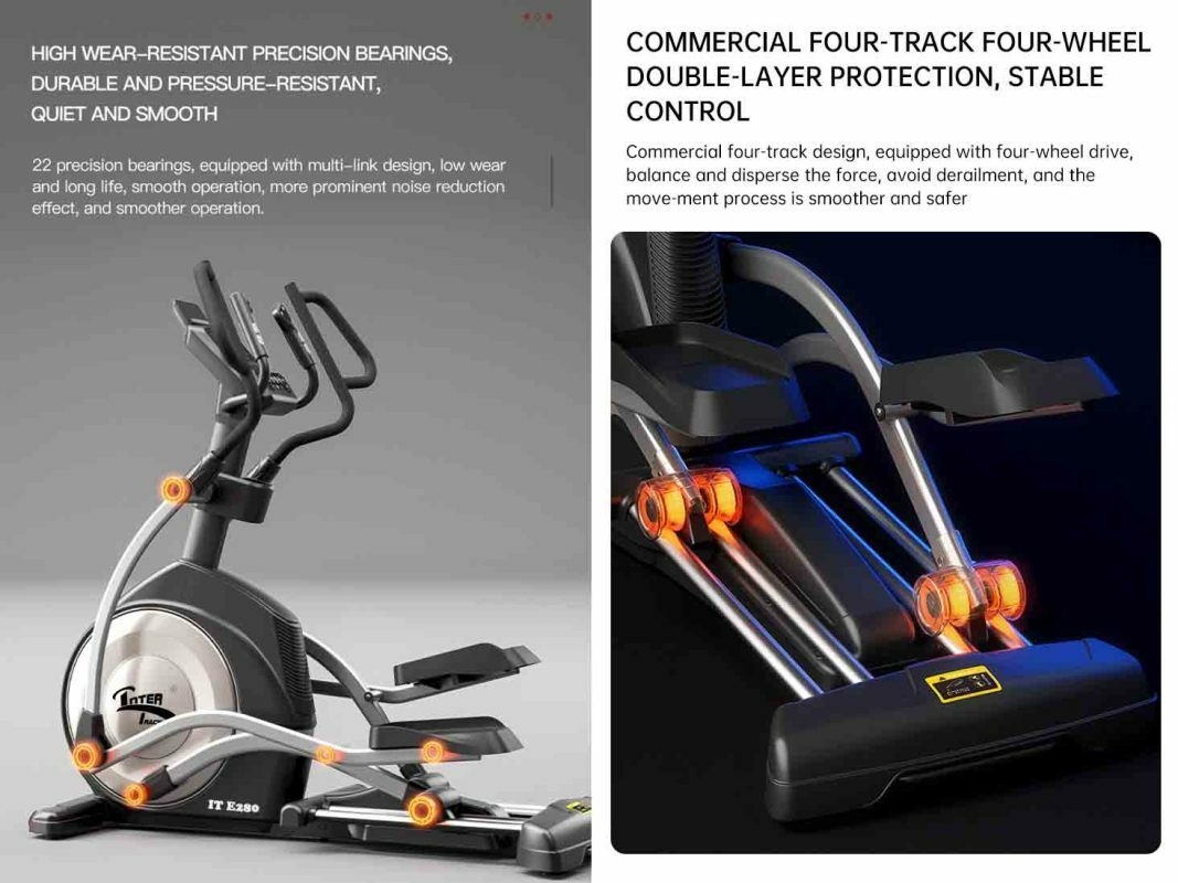 مزود بـ 22 محملًا دقيقًا وتصميم تجاري بأربع مسارات وأربع عجلات، يضمن الجهاز الإهليليجي المتانة، وانخفاض الضوضاء، وسلاسة التشغيل، واستقرارًا معززًا لتجربة تمرين أكثر أمانًا وكفاءة.