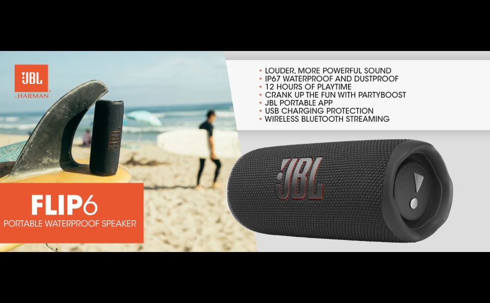 To the pool. To the park. JBL Flip 6 is IP67 waterproof and dustproof, so you can bring your speaker anywhere.Don't sweat the small stuff like charging your battery. JBL Flip 6 gives you up to 12 hours of playtime on a single charge.Flip 6 also features optimized dual passive radiators for deep bass, fine-tuned with using Harman's advanced algorithm.