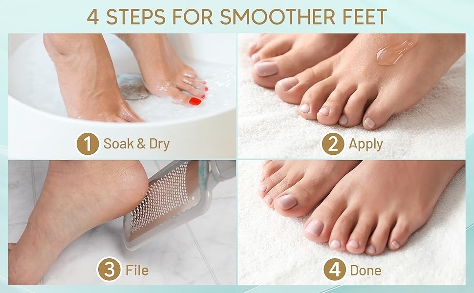 استخدمي القفازات المرفقة لتطبيق الجل مباشرةً على المناطق المصابة (مع تجنب الجلد الناعم). اتركيه لمدة 5 دقائق، ثم قشريه بمبرد القدمين، ثم اشطفيه، لتحصلي على قدمين ناعمتين وجميلتين