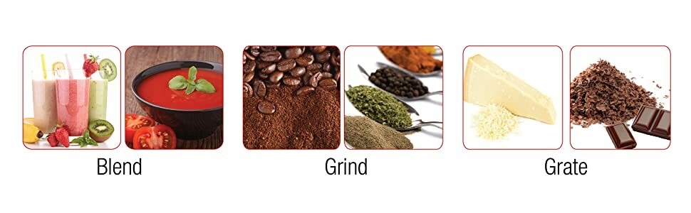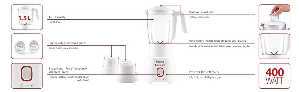 • من المُصنع: <ul><li>- 450W</li><li>- 1 speed + pulse</li><li>- 1.5L blender jug</li><li>- Attachments: Grater and grinder</li></ul><p><br />&nbsp;</p>