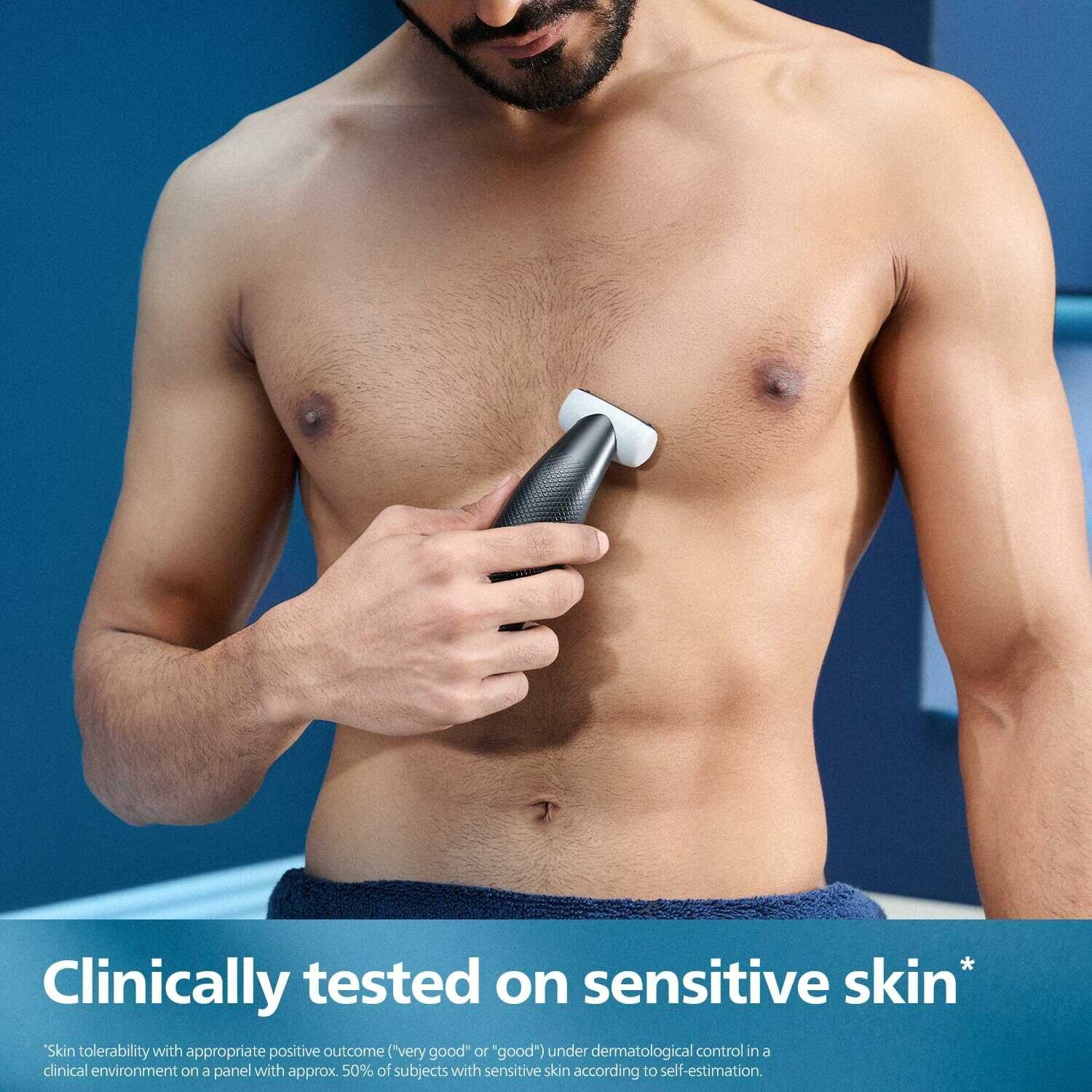ماكينة حلاقة الجسم Philips Bodygroom Series 3000 هي ماكينة حلاقة لاسلكية مخصصة للجسم، مصممة لتشذيب آمن وسلس، حتى في المناطق الحساسة. رأس الحلاقة ثنائي الأبعاد الذي يتبع شكل الجسم يستخدم تقنية Skin Protect، ويتميز برؤوس مستديرة وطبقة رقيقة مضادة للحساسية لحماية بشرتك من الجروح والتهيج.