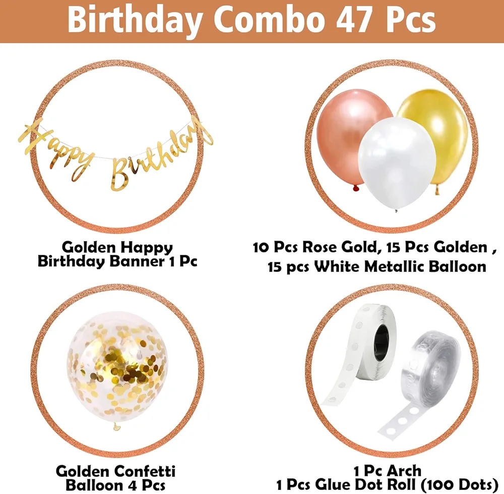 BIRTHDAY PARTY: The pack includes 1Pc golden happy birthday letter foil banner, 15pcs white metallic balloons, 15pcs golden metallic, 10pcs rose gold metallic, 4pcs golden confetti, 1pc arch and 1pc glue dots for birthday decorations for kids, husband, women, mothers etc.