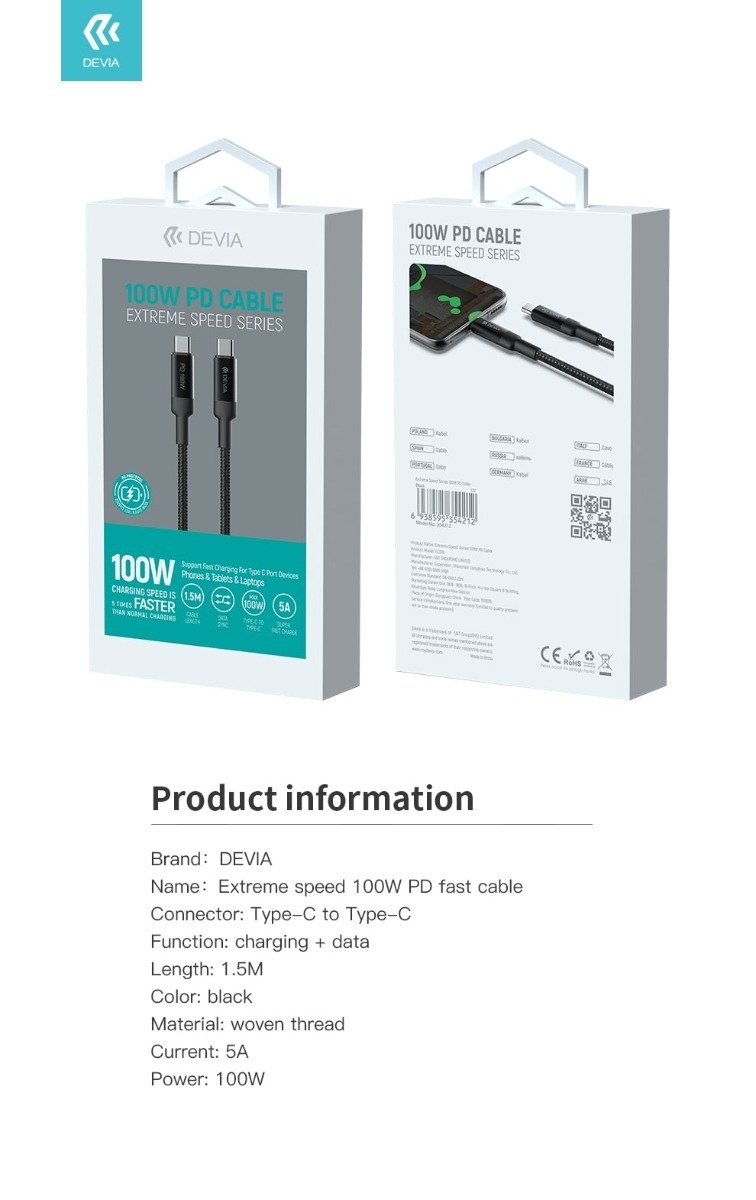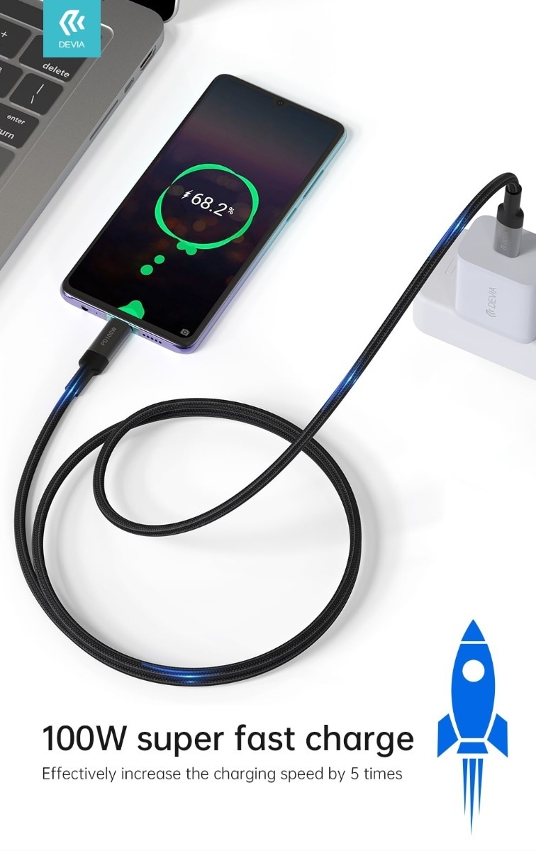 Devia EC309 Type-C Cable Extreme Speed 100W PD Support Fast Charging for All Laptops & Phones in Market 1.5M - Black