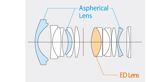 The optical design contains 15 elements in 9 groups, including three aspherical elements and one ED element to limit distortion and spherical aberration for optimal sharpness and accurate rendering. The design produces beautifully sharp images from corner to corner with little-to-no distortion at the frame's edges.