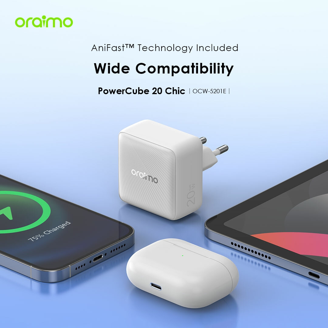 يوفر oraimo PowerCube 20 Chic شحنًا ثابتًا وسريعًا بقوة 20 واط، وهو أسرع بثلاث مرات من الشاحن التقليدي 5 واط، مما يضمن وصول جهازك إلى الشحن الكامل بسرعة.