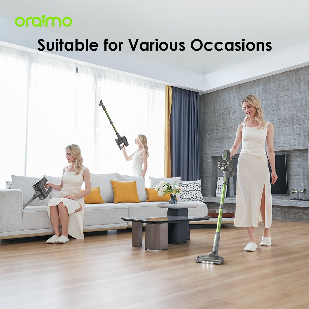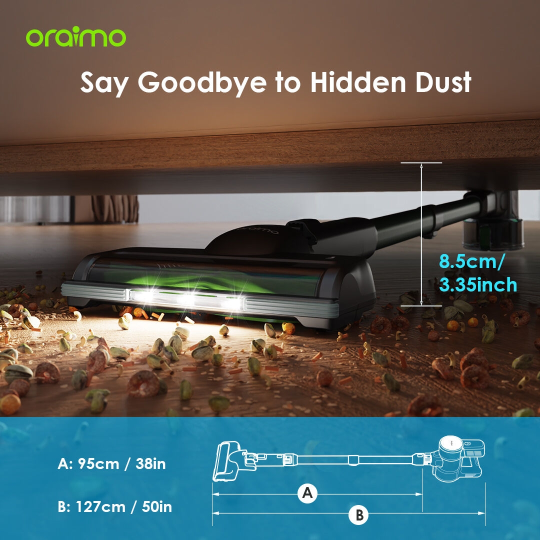 With upgraded 270W brushless motor, oraimo UltraPure cordless vacuum cleaner provides up to 24kpa strong suction, effortlessly remove dirt, debris, dust, pet hair, and stubborn dirt, leaving no residue after vacuuming.