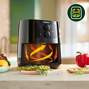 The Philips Essential Airfryer uses hot air to cook your favorite foods to crispy perfection, with up to 90% less fat.*