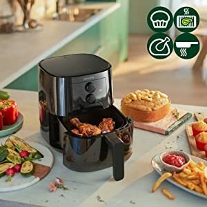 The integrated timer allows you to preset cooking times of up to 60 minutes. The auto shutoff function includes a sound to let you know your dish is ready. A fully-adjustable temperature control lets you preset the best heat setting for the food you're cooking, up to 200 degrees. Enjoy crispy golden-brown fries, snacks, tasty chicken and more – all prepared at the right temperature for the ideal amount of time.