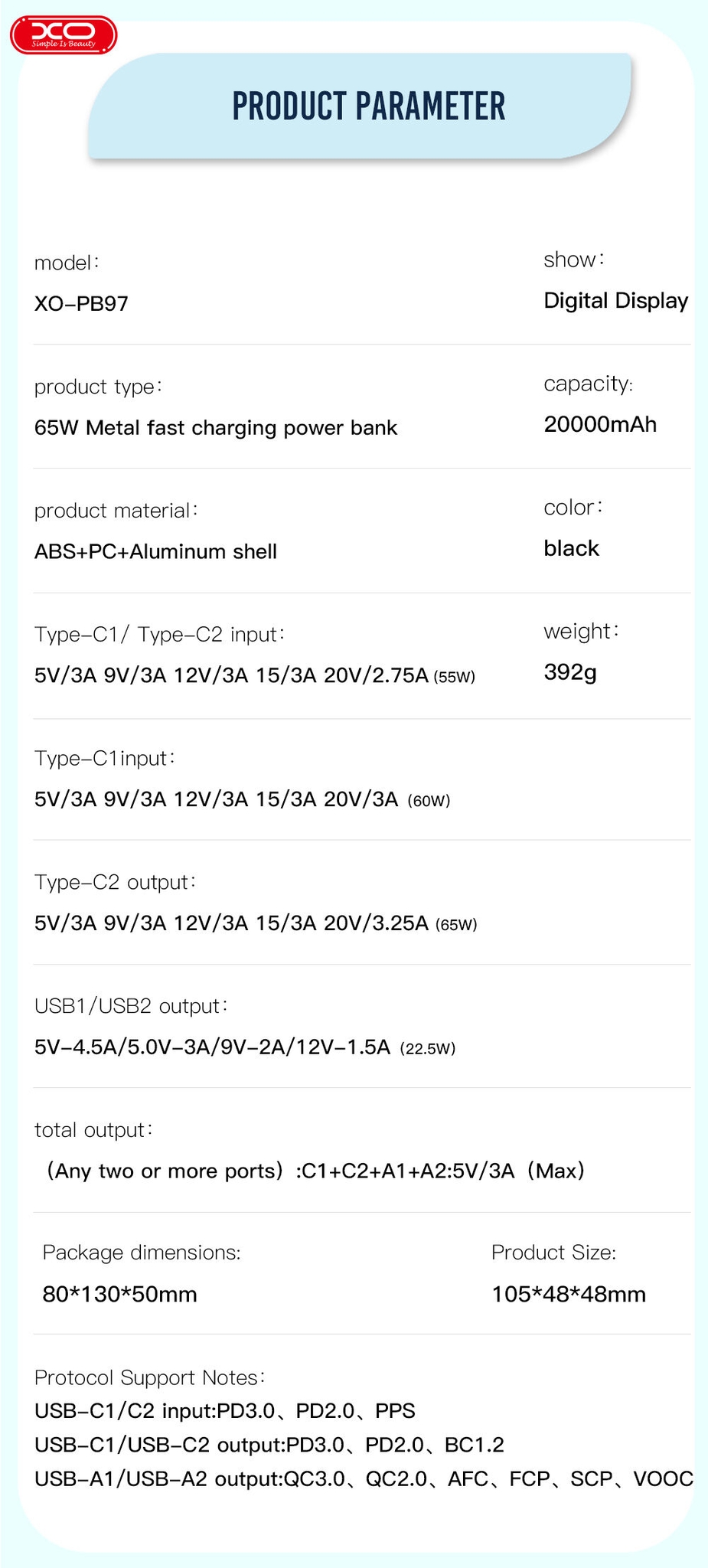 Introducing our versatile 20000mAh power bank, built to keep you powered up wherever you go, including your laptop. With a high capacity and a digital display for precise power monitoring, it's your ultimate solution for extended charging needs. Crafted with a robust ABS + PC flame retardant + aluminum alloy shell, housing a dependable lithium-ion battery. Featuring dual Type-C inputs/outputs with rapid charging capabilities and USB ports delivering efficient power output. With a total output of 60W for Type-C1, 65W for Type-C2, and 22.5W for USB1/USB2, you can combine ports for maximum output, ensuring all your devices, including laptops, stay powered up. Compact in size and lightweight, it's designed for convenience without compromising on performance. Supported protocols include PD3.0, PD2.0, PPS for USB-C inputs/outputs, and QC3.0, QC2.0, AFC, FCP, SCP, VOOC for USB-A outputs. Stay charged and connected on-the-go with our versatile 20000mAh power bank, ensuring you never miss a beat, even when you're away from an outlet.
